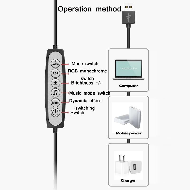 11. Χρώμα φωτός: τρία χρώματα (ψυχρό φως, ζεστό φως, φυσικό φως) + RGB 17 στατικά χρώματα + CCT + 13 δυναμικά χρώματα + τέσσερις λειτουργίες μουσικού ρυθμού