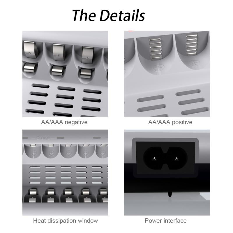 1. Ανεξάρτητη φόρτιση σε 8 υποδοχές, μπορεί να φορτίσει ταυτόχρονα ή κατά βούληση οκτώ μπαταρίες AAA, AA.