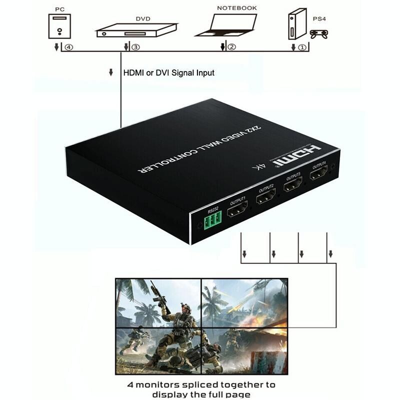 9. The main function is to divide a complete HDMI/DVI high-definition image signal into 4 blocks and then distribute them to 4 video display units (such as rear projection units, LCD TVs, etc.), and complete 4 hdmi high-definition video display units to form one Dynamic image large screen