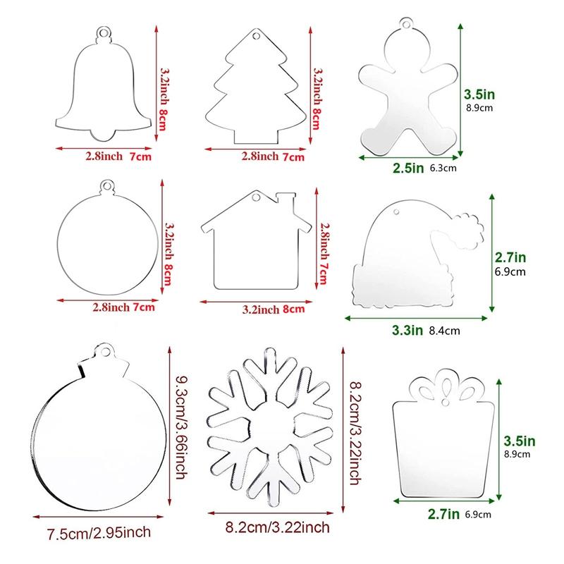 6. Size: bell/tree/round/house about 7 x 8cm, gift box about 6.9 x 8.9cm, snowman about 6.3 x 8.9cm, hat about 6.9 x 8.4cm, triangular round about 7.5 x 9.3cm, snowflake about 8.2 x 8.2cm, thick about 0.2cm, red rope length about 30cm x 10 pcs