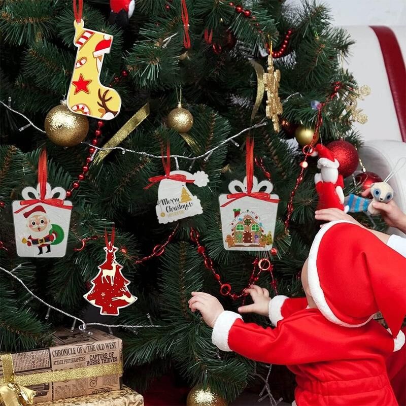 6. Μέγεθος: κουδούνι/δέντρο/στρογγυλό/σπίτι περίπου 7 x 8cm, κουτί δώρου περίπου 6.9 x 8.9cm, χιονάνθρωπος περίπου 6.3 x 8.9cm, καπέλο περίπου 6.9 x 8.4cm, τριγωνικό στρογγυλό περίπου 7.5 x 9.3cm, νιφάδα χιονιού περίπου 8.2 x 8.2cm, πάχος περίπου 0.2cm, μήκος κόκκινης κορδέλας περίπου 30cm x 10 τεμ
