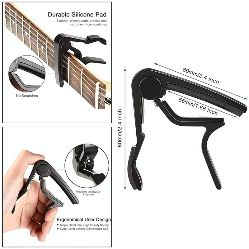 1. Προδιαγραφές: κλιπ διαμόρφωσης x 1 (μαύρο) + πέλεκυς x 5 (0.46mm τυχαίο χρώμα) + συντονιστής x 1 + εργαλείο αλλαγής χορδών 3 σε 1 x 1 + μαύρη θήκη πέλεκυ x 1