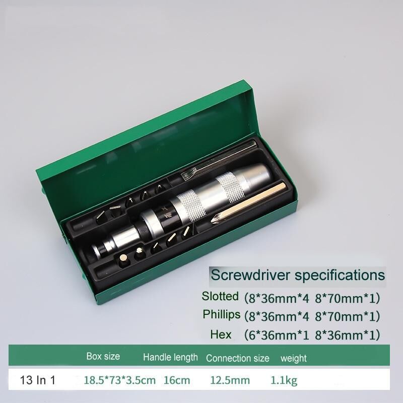 7. 13-piece bit size: 5 cross bits (4pcs 8x36 mm, 1pc 8x70 mm), 5 slotted (4pcs 8x36 mm, 1pc 8x70 mm), 2 hexagonal bits ( 1pc 6x36mm,1pc 8x36mm)