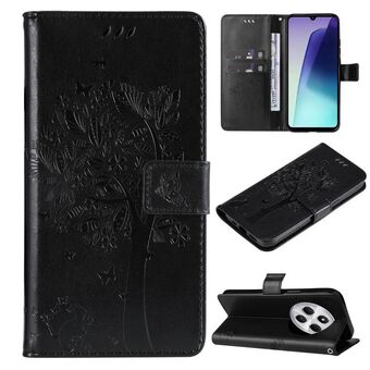 For Redmi 14C 4G Global Tree & Cat Embossed Pattern Flip Leather Phone Case(Black)