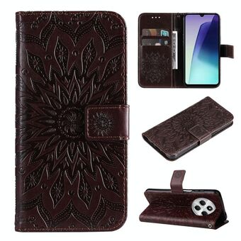 Για Redmi 14C 4G ανάγλυφο ηλιοτρόπιο μοτίβο Flip υπόθεση τηλεφώνου δέρμα (καφέ)