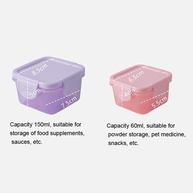 6. Η χωρητικότητα των 150ml είναι κατάλληλη για αποθήκευση συμπληρωμάτων διατροφής, σάλτσας που παίρνετε μαζί σας κ.λπ. και η χωρητικότητα των 60ml είναι κατάλληλη για αποθήκευση σκόνης, φαρμάκων για κατοικίδια ζώα, μικρών σνακ κ.λπ.