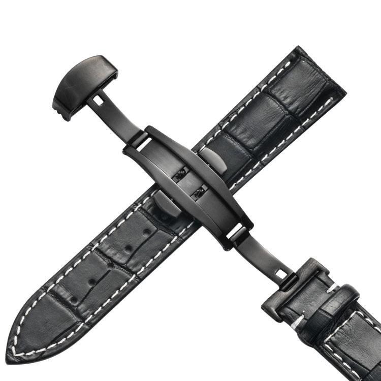 Λουρί ρολογιού από δέρμα αγελάδας 16mm, κλασικό, μαύρο με αγκράφα πεταλούδας (Μαύρες Λευκές Γραμμές)