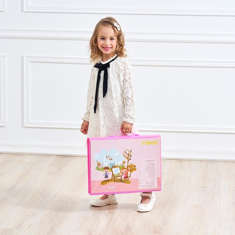 9. Contains 24 color fine watercolor pens, 24 color A grade oil pastels, 18 color solid powder paints, 24 color pencils, 24 colors A grade crayons, 12 colors washable watercolor pens, 1 ruler, 1 pencil, 1 Eraser, 1 pencil sharpener, 1 paint brush, 1 paint tray, 1 white glue