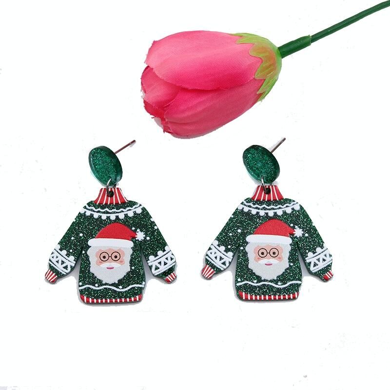 1 ζευγάρι σκουλαρίκια πουλόβερ Χριστουγέννων, χαριτωμένα ελαφάκια και χιονάνθρωποι, χρώμα: Πράσινο του γέρου.