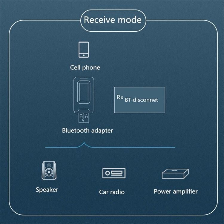 7. Λειτουργία RX: σχεδιασμένο για στερεοφωνικά συστήματα αυτοκινήτου/ηχεία/ακουστικά και τις περισσότερες κινητές συσκευές με θύρες βοηθητικού 3.5mm, κάνοντας τα συνηθισμένα ηχεία να γίνουν άμεσα ασύρματα στερεοφωνικά ηχεία Bluetooth, μεταδίδοντας ασύρματα μουσική από smartphones σε στερεοφωνικά συστήματα αυτοκινήτου ή σπιτιού