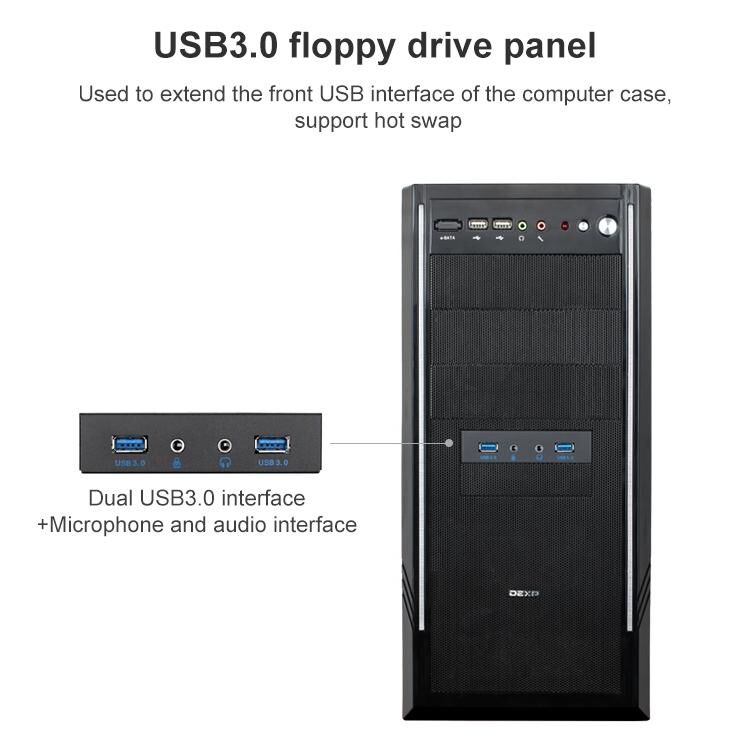6. Χρησιμοποιήστε αυτή τη συσκευή για να μετατρέψετε απευθείας τη διεπαφή 20PIN και τον ήχο στην πλακέτα σε 2 διεπαφές USB3.0, έξοδο ακουστικών και διεπαφή μικροφώνου και να τα εγκαταστήσετε σε θέση αδρανούς μονάδας δισκέτας. Αυτό παρέχει μια μπροστινή διεπαφή USB και μια διεπαφή ήχου.