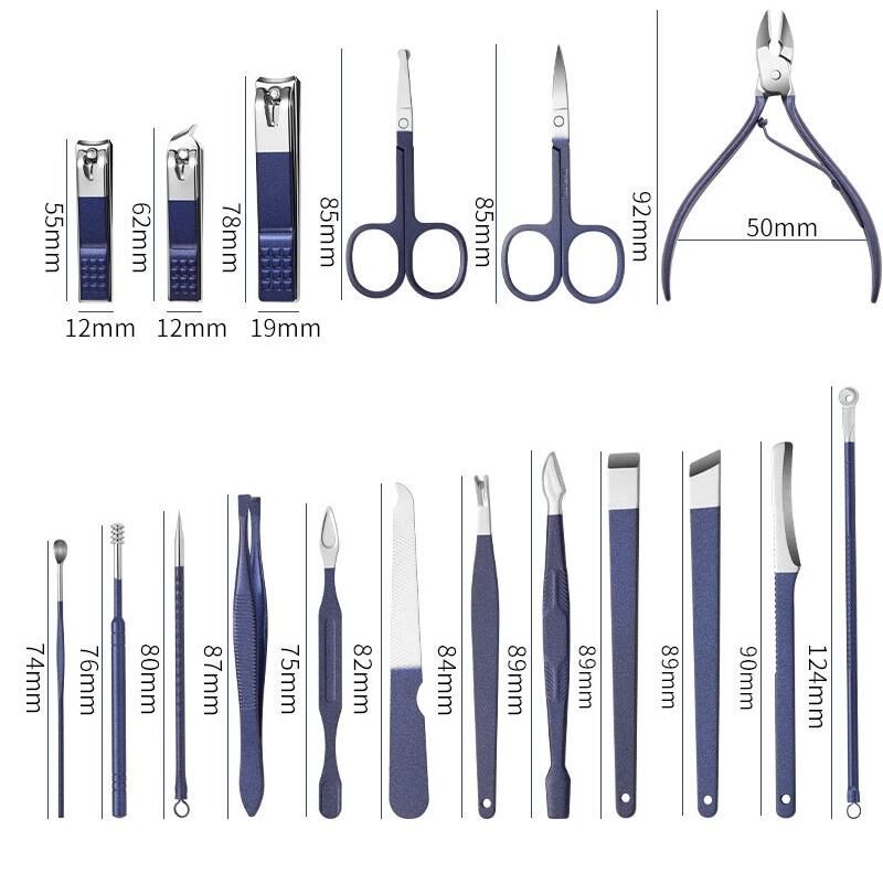 -18-piece set: medium nail clippers + oblique nail clippers + large nail clippers + dead skin push + nail file + closed knife + double-head pick + flat pedicure knife + oblique pedicure knife + meniscus pedicure knife + dead skin Scissors + nose hair scissors + eyebrow scissors + eyebrow clip + acne squeezing device + ear pick + spiral ear pick + acne needle