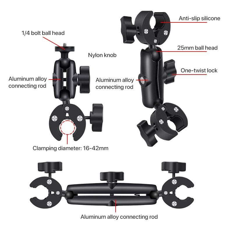 5. Widely used to install panoramic cameras, sports cameras, mobile phones, convenient for the first perspective shooting, can be used for live broadcast, selfie, etc.; Can also be used to link the installation of vehicle navigation