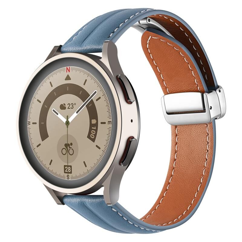 22mm Folding Buckle Grooved Genuine Leather Watch Band, Silver Buckle(Blue)