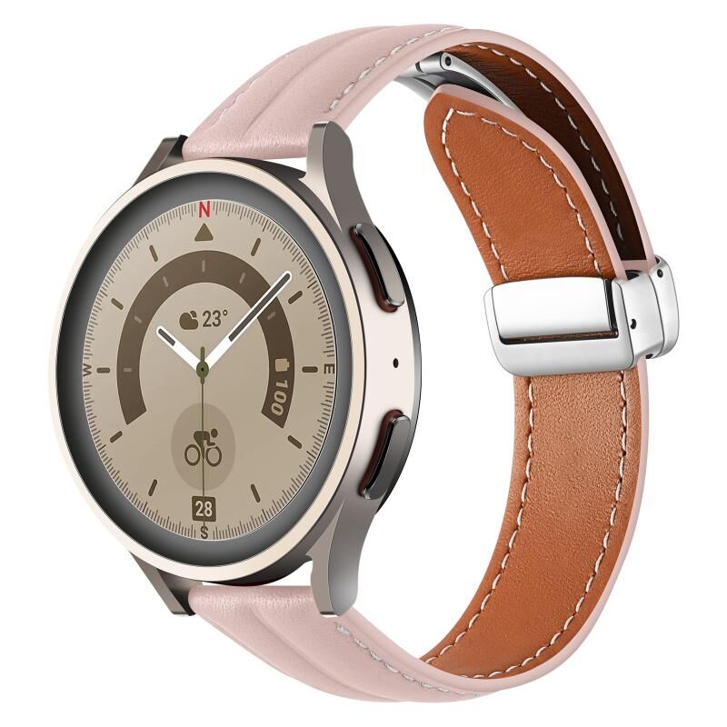 22mm Folding Buckle Grooved Genuine Leather Watch Band, Silver Buckle(Light Pink)