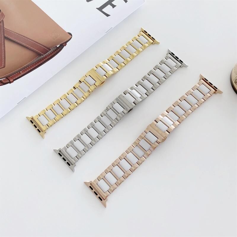 22mm Width Three Beads Ceramics Steel Watch Band For Apple Watch Series 9&8&7 41mm / SE 3&SE 2&6&SE&5&4 40mm / 3&2&1 38mm(Rose Gold+White)