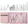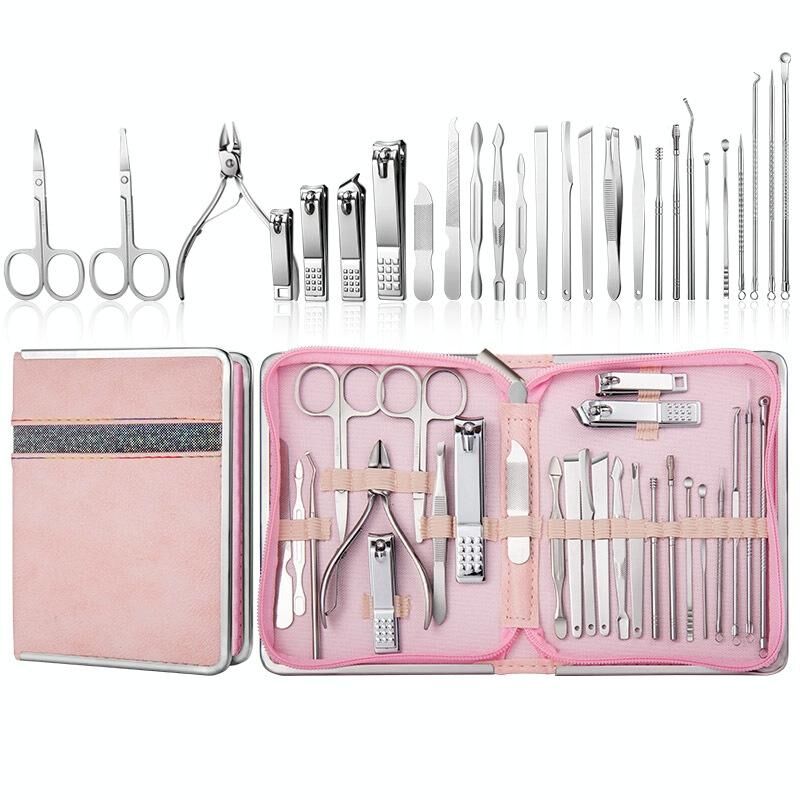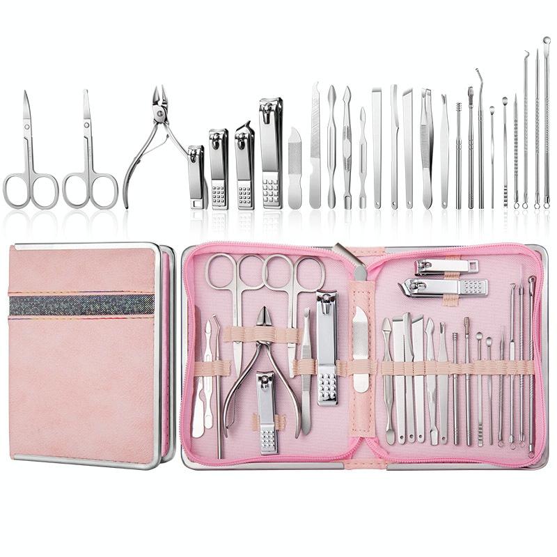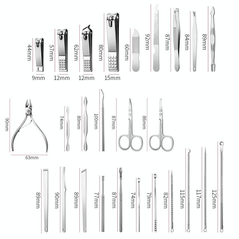 -Σετ 18 τεμαχίων: μεγάλο νυχοκόπτη + μικρό νυχοκόπτη + πλάγιο νυχοκόπτη + ψαλιδάκι φρυδιών + λίμα νυχιών + τσιμπιδάκι φρυδιών + πιρούνι για νεκρό δέρμα + εργαλείο επιλογής νυχιών + κουταλοειδές εργαλείο καθαρισμού αυτιών + βελόνα για ακμή + εργαλείο ώθησης από ατσάλι + ψαλιδάκι για νεκρό δέρμα + πλάγιο μαχαίρι για πεντικιούρ + επίπεδο μαχαίρι για πεντικιούρ + ημισεληνοειδές μαχαίρι για πεντικιούρ + ελατηριωτό εργαλείο καθαρισμού αυτιών + βελόνα για ακμή αγκώνα + ραβδί πίεσης για ακμή