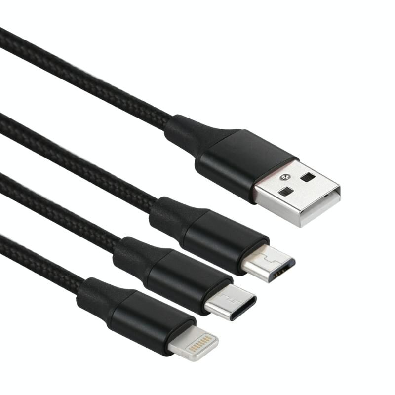 Καλώδιο φόρτισης USB σε 8 ακίδες & USB-C / Type-C & Micro USB, πλεγμένο από νάιλον, 1,2μ, 2A (Μαύρο)
