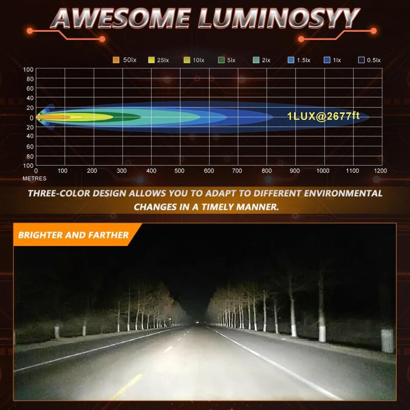 2. Achieve extremely high light utilization. When the high and low beams are turned on, different perfect light patterns can be matched to produce a wider range of low beam center points, and the high beam illumination distance is farther and more focused, which can meet various driving needs in rainy days, foggy days or at ordinary times. The projection distance is up to about 600 feet, making your driving more comfortable.