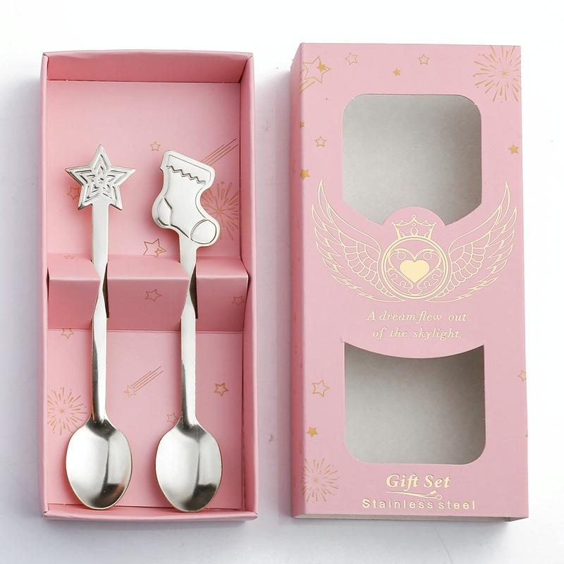 2pcs /Pack Christmas Stainless Steel Spoon Tableware Gift Set, Color: Pink Box Silver Socks+Stars