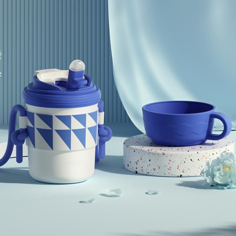 Θερμός από ανοξείδωτο ατσάλι 316, 300ml, με καλαμάκι για τρεις χρήσεις, κούπα καφέ για άμεση κατανάλωση (Μπλε)