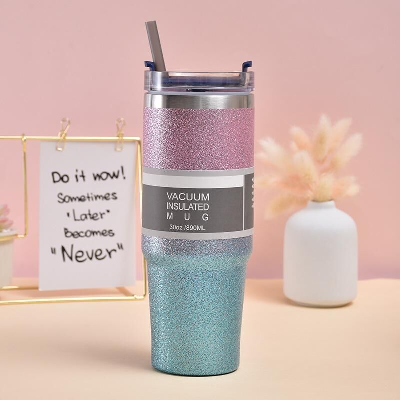 Κούπα καφέ με μόνωση Glitter 30oz, Διπλό στρώμα, Κούπα πάγου, Ανοξείδωτη κούπα αυτοκινήτου με καλαμάκι (Μπλε Ασημί)