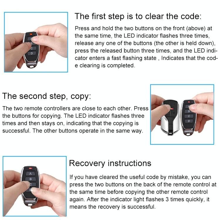 10. Πεδίο εφαρμογής: κατάλληλο για αντιστοίχιση και αντιγραφή τηλεχειριστηρίων ηλεκτρικών θυρών, τηλεχειριστηρίων αναδιπλούμενων θυρών, τηλεχειριστηρίων γκαραζόπορτας, τηλεχειριστηρίων ελέγχου κινητήρα, τηλεχειριστηρίων ελέγχου κουρτινών, τηλεχειριστηρίων LED, τηλεχειριστηρίων αυτοκινήτων και μοτοσικλετών, τηλεχειριστηρίων βιομηχανικού εξοπλισμού, κ.λπ.