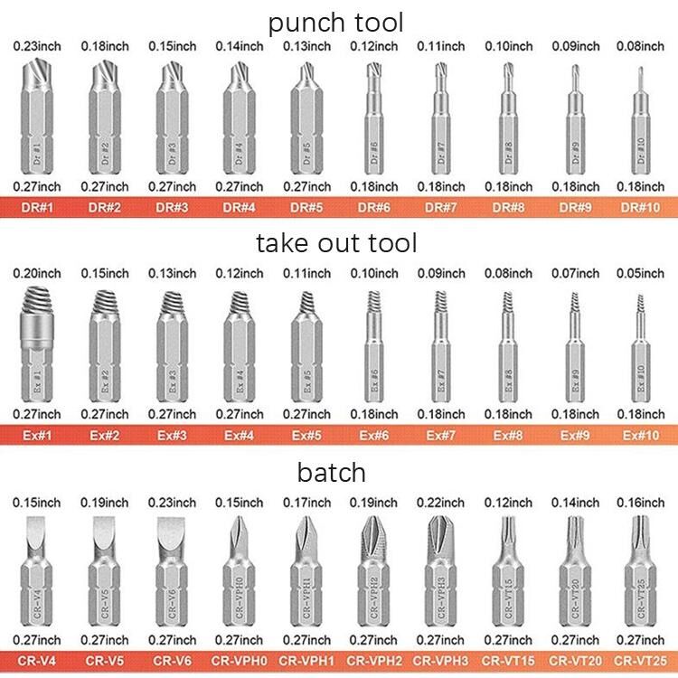 1. Κατασκευασμένο από χάλυβα υψηλής ταχύτητας, με υψηλή σκληρότητα και ισχυρή αντοχή στη φθορά 2. Διάφορες προδιαγραφές, ευρεία εφαρμογή, εύκολο στη χρήση, σε κουτί για εύκολη αποθήκευση και μεταφορά 3. Πεδίο εφαρμογής: εργαλείο για την αφαίρεση σπασμένων βιδών 4. Υλικό: χάλυβας υψηλής περιεκτικότητας σε άνθρακα 5. Διαστάσεις κουτιού: περίπου 13x10x3,3 cm 6. Βάρος: περίπου 240g/σετ Λίστα συσκευασίας: - Εργαλείο διάτρησης x10: DR 1/DR 2/DR 3/DR 4/DR 5/DR 6/DR 7/DR 8/DR 9/DR 10 - Εργαλείο αφαίρεσης x10: Ex 1/Ex 2/Ex 3/Ex 4/Ex 5/Ex 6/Ex 7/Ex 8/Ex 9/Ex 10 - Σετ x10: CR-V4/CR-V5/CR-V6/CR-VPH0/CR-VPH1/CR-VPH2/CR-VPH3/CR-VT15/CR-VT20/CR-VT25 - Βάση τρυπανιού x1 - Γρήγορη βάση τρυπανιού x1