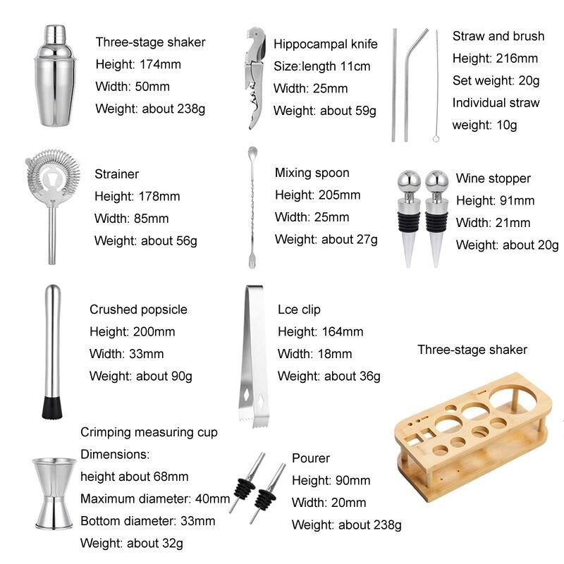 9. Packing list: strainer x 1, crimping measuring cup x 1, shaker x 1, straw x 2, hippocampus knife x 1, ice crusher x 1, stirring spoon x 1, brush x 1, ice clip x 1, wine pourer x 2, wine stopper x 2, bamboo stand x 1