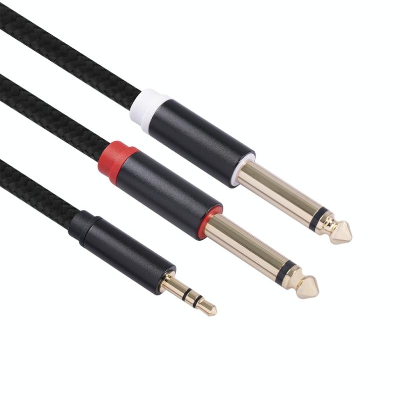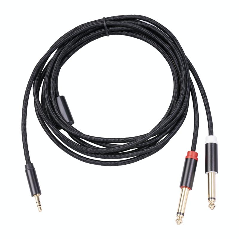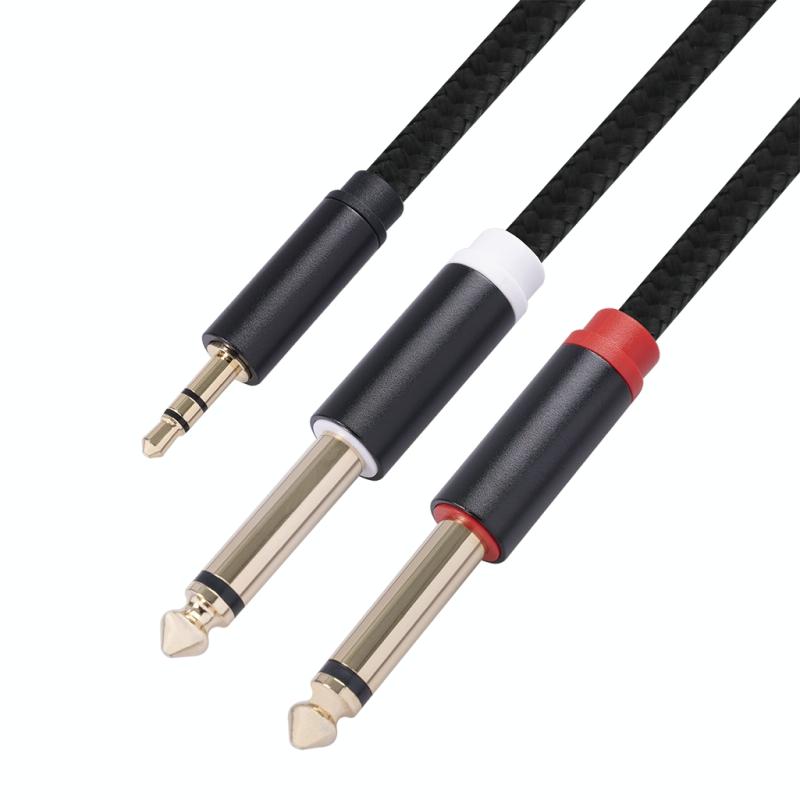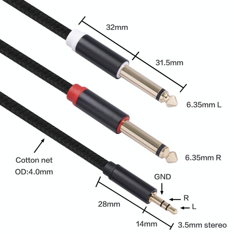 6. The audio cable can be used to split a 3.5mm unbalanced stereo signal into two 6.35mm TS (left/right) unbalanced mono signals, or to combine two 6.35mm mono signals (left/right) It is a single 3.5mm stereo signal. Its bifurcation is closer to the 6.35mm end, and the distance from the bifurcation point to the 6.35mm interface is about 35cm