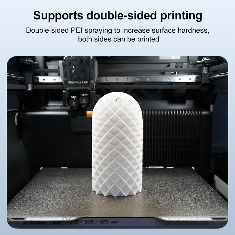 2. The premium PEI coating is highly versatile, compatible with a wide range of materials such as PLA, PETG, ABS, TPU. Offering strong adhesion, excellent wear resistance, and heat tolerance, its considered the ideal surface for most printing conditions.