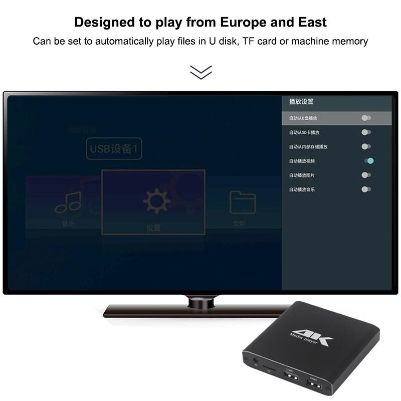 Υποστηρίζει ανάλυση 4K full HD έως 4096X2160P, μορφές MP4, MKV, TS, M2TS, MTS, TP, TRP, WMV, IFO, ISO, VOB, DAT, AVI, MPG, MOV, RM, RMVB, DIVX, XVID, FLV, F4V, blue και άλλες, καθώς και παρουσιάσεις PPT.