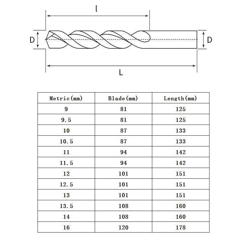 13. Model: diameter 9.0mm: groove length 81mm, total length 125mm; diameter 9.5mm: groove length 81mm, total length 125mm; diameter 10mm: groove length 87mm, total length 133mm; diameter 10.5mm: groove length 87mm, total length 133mm; diameter 11mm: groove length 94mm, total length 142mm; diameter 11.5mm: groove length 94mm, total length 142mm; diameter 12mm: groove length 101mm, total length 151mm; diameter 12.5mm: groove length 101mm, total length 151mm; diameter 13mm: groove length 101mm, total length 151mm; diameter 13.5mm :Ditch length 108mm, total length 160mm; diameter 14mm: groove length 108mm, total length 160mm; diameter 16mm: groove length 120mm, total length 178mm