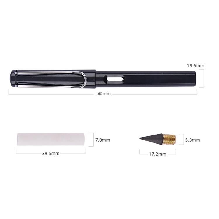 1. Υλικό: πλαστικό, κράμα 2. Σκοπός: γραφή, σχέδιο 3. Προδιαγραφή: HB 4. Μέγεθος: περίπου 14x1,36 εκ./τεμάχιο 5. Βάρος: περίπου 20γρ./τεμάχιο Χαρακτηριστικά: 1. Μύτη από κράμα, δεν χρειάζεται κόψιμο, μπορεί να αντικατασταθεί χωρίς να σπάσει 2. Πάχος HB 0,5mm, το πάχος και η σκουρότητα ενός τυπικού μολυβιού 3. Χρησιμοποιώντας μύτη από κράμα βολφραμίου, δεν χρειάζεται μελάνι, μπορεί να σβηστεί με γόμα, γράφει ομαλά, χωρίς να λερώνονται τα χέρια 4. Το σώμα του στυλό περιέχει μια γόμα, η οποία είναι εύκολη στη χρήση 5. Σωστή στάση κρατήματος του στυλό 6. Η αεροδυναμική, φαρδιά θήκη στυλό κάνει το βιβλίο σταθερό και δεν πέφτει εύκολα