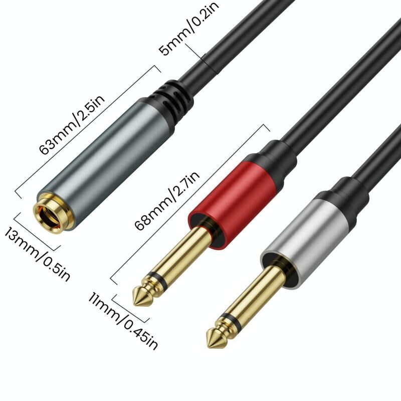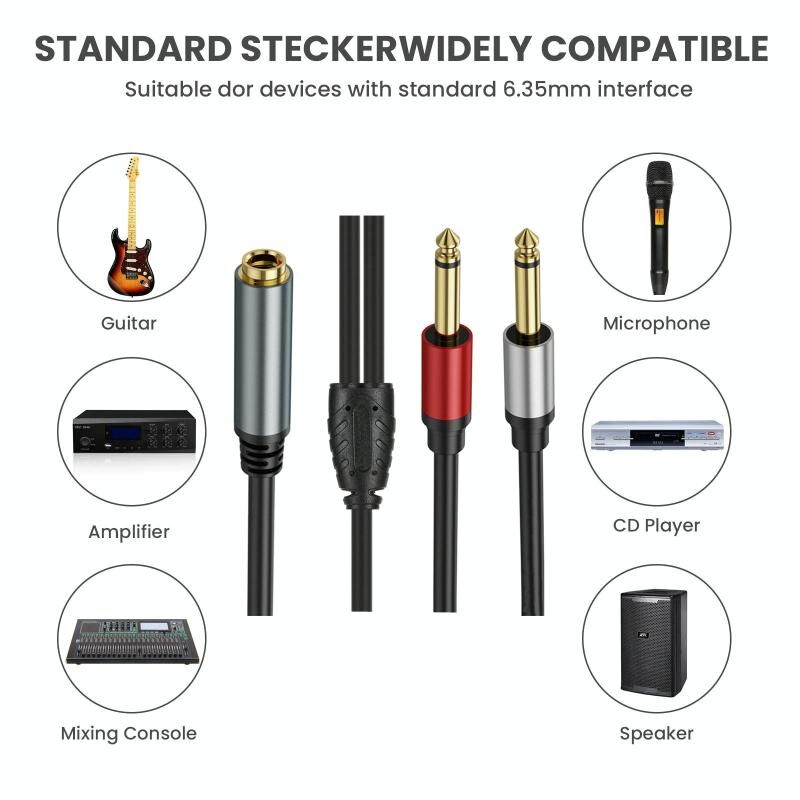 4. Το προϊόν είναι κατάλληλο για: Το καλώδιο σύνδεσης 6,35 mm διπλού καναλιού TRS θηλυκό σε διπλό μονοφωνικό TS αρσενικό 6,35 mm τύπου Y είναι κατάλληλο για τον περισσότερο επαγγελματικό εξοπλισμό ήχου και τον οικιακό εξοπλισμό ήχου. Συμβατό με ενισχυτές, μικρόφωνα, μίκτες, ηχεία, μουσικά πλήκτρα, συστήματα HiFi, εξοπλισμό οικιακού κινηματογράφου, κιθάρες, ηλεκτρονικά πιάνα ή δέκτες AV.