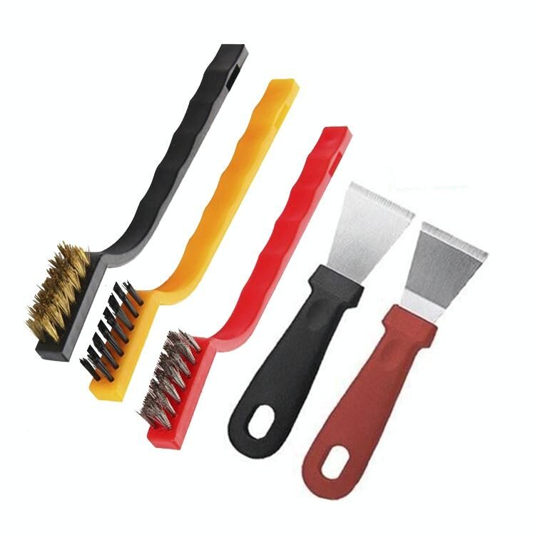 Σετ 5 τεμαχίων: συρμάτινη βούρτσα x 1, συρμάτινη βούρτσα x 1, νάιλον βούρτσα x 1, ίσιο φτυάρι x 1, καμπύλο φτυάρι x 1