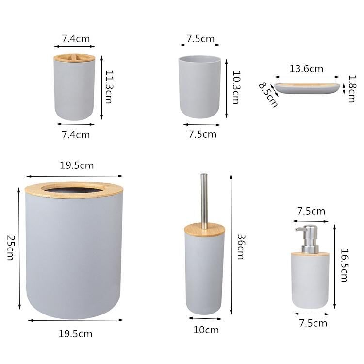 5. Το σετ των έξι τεμαχίων περιλαμβάνει: κάδο απορριμμάτων X1, βούρτσα τουαλέτας X1, μπουκάλι λοσιόν X1, σαπουδiera X1, κούπα οδοντόβουρτσας X1, κούπα στοματικού διαλύματος X1