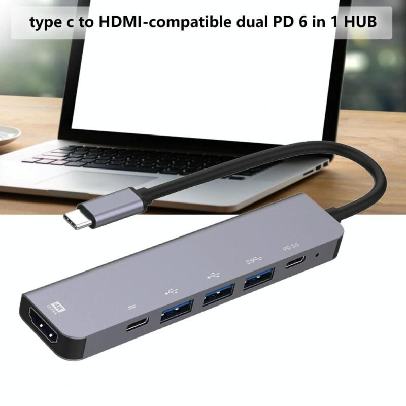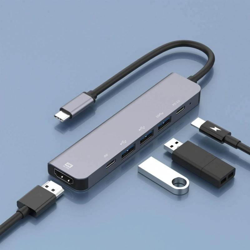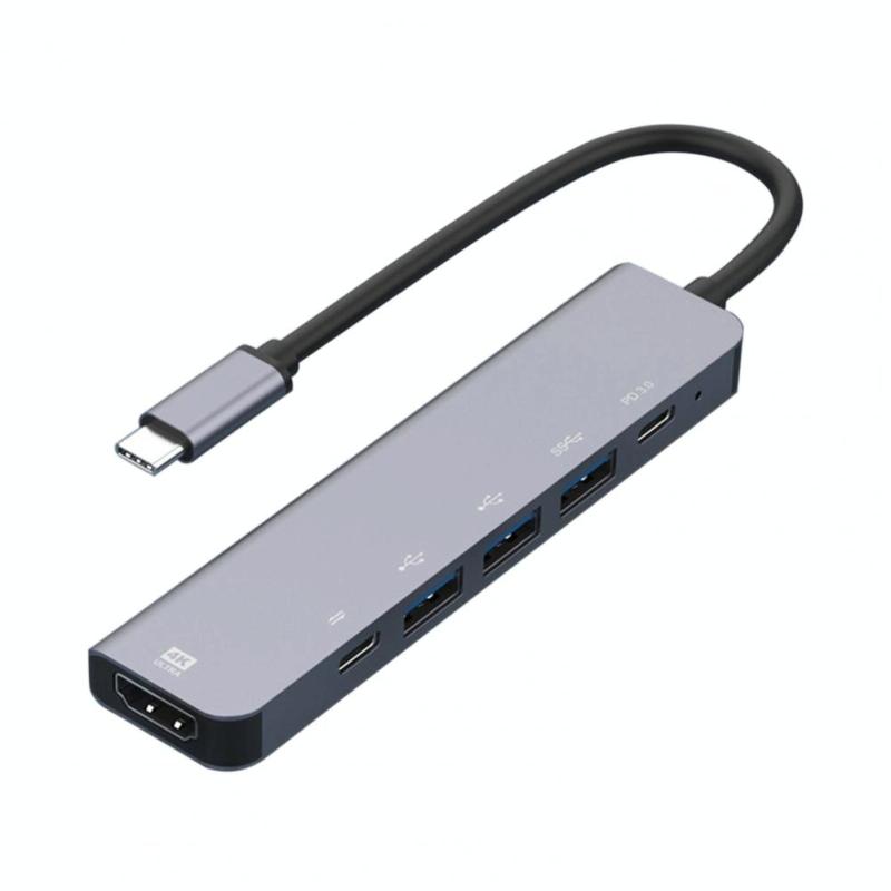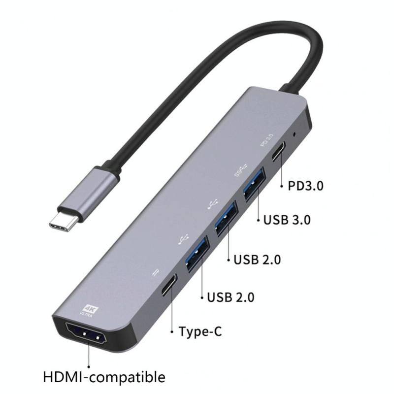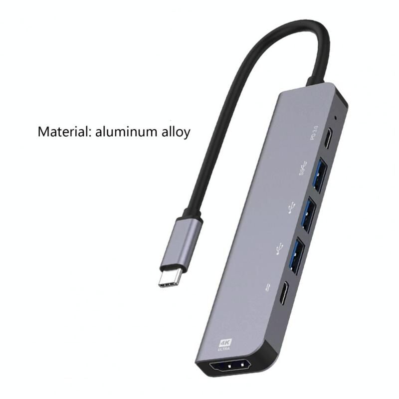 5.This Type-C multi-port adapter has 1 HDMI 4K30Hz compliant video output port, 1 USB-C 100W power supply charging, 1 PD data and 3 USB ports for data transmission. Its data transmission is stable and fast without disconnecting. It supports USB 3.0 / 2.0, such as USB devices, flash drive, WiFi adapter, mouse, keyboard and other low speed devices.