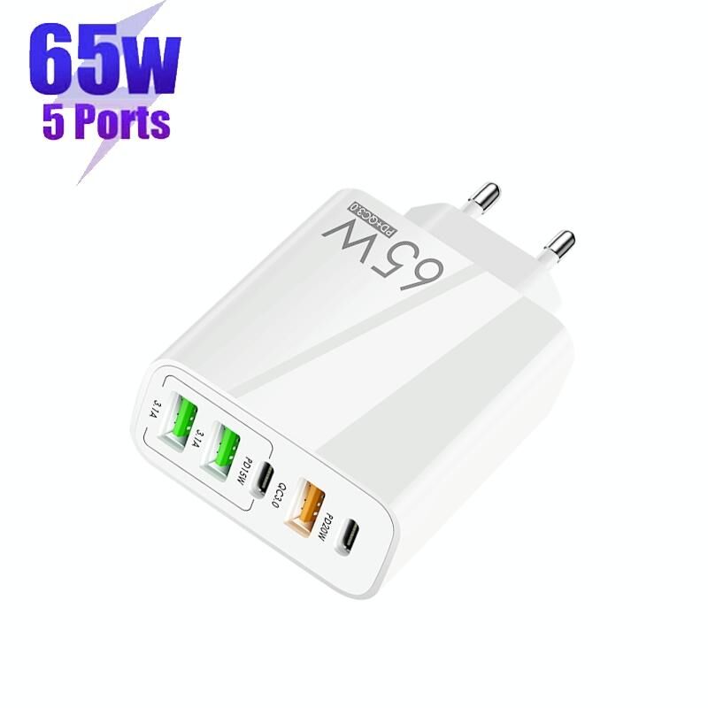 Φορτιστής πολλαπλών θυρών 65W Dual PD Type-C + 3 x USB για Κινητό και Tablet PC, Ευρωπαϊκό βύσμα (Λευκό)