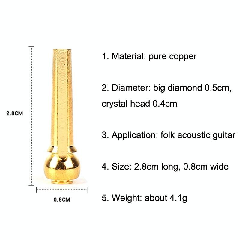 1. Επιλογή καθαρού χαλκού υψηλής ποιότητας, σταθερή προφορά και ανθεκτικότητα στη διάβρωση, αυξάνει την αγωγιμότητα της χορδής στους κραδασμούς της γέφυρας. 2. Πολλαπλή γυάλισμα, σχολαστική κατασκευή, με καλή καθαρότητα και αντοχή στη φθορά. 3. Βελτιώνει αποτελεσματικά την επέκταση του ήχου και ενισχύει την αίσθηση της κοκκομετρίας με βάση την αρχική κιθάρα. 4. Υλικό: καθαρός χαλκός. 5. Διάμετρος: μεγάλο διαμάντι 0,5cm, κρυστάλλινη κεφαλή 0,4cm. 6. Εφαρμογή: λαϊκή ακουστική κιθάρα. 7. Μέγεθος: μήκος 2,8cm, πλάτος 0,8cm. 8. Βάρος: περίπου 4,1g.