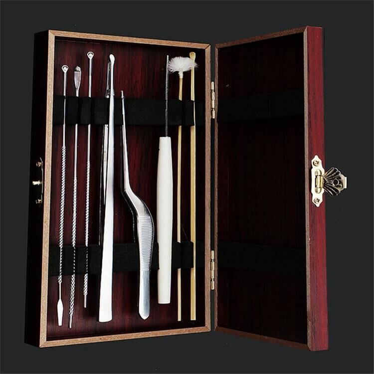 6. Set includes: X1 bamboo ear spoon, X1 straight handle tweezers, X1 curved handle tweezers, X1 feather goblet, X1 long handle ear grill, X1 hollow ear spoon, X1 long handle ear spoon, X1 ear shaving knife
