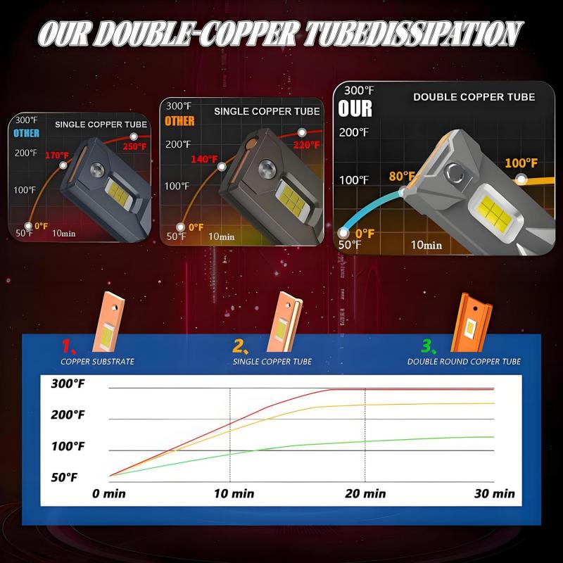 3. The lamp bead substrate consists of two copper sheets + two copper tubes. The copper sheet and the copper tube have better thermal conductivity, achieving double-sided thermal conductivity. The substrate is closely combined with the aluminum lamp body and fully contacted, which can quickly and efficiently transfer the temperature of the lamp bead to the bottom fan, greatly improving the heat dissipation effect.