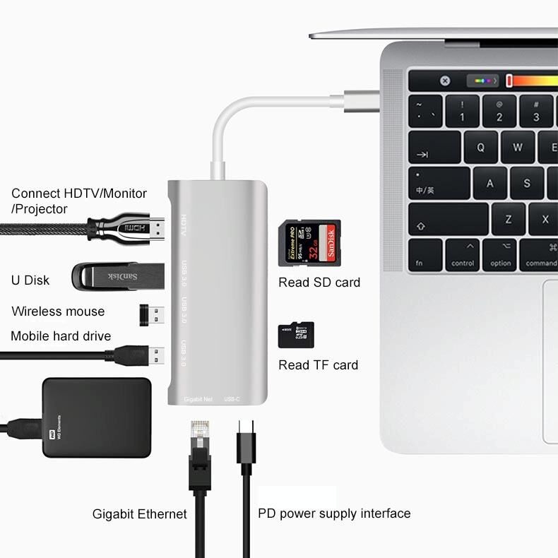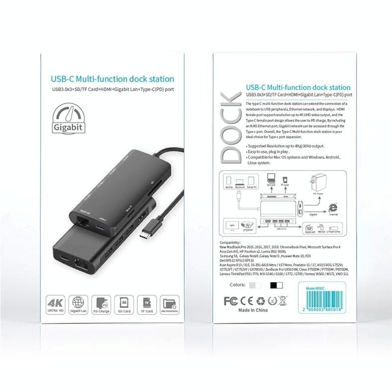 6: Τύπος-C αρσενικό x1, Τύπος-C θηλυκό x1, USB 3.0 θηλυκό x3, HDMI θηλυκό x1, RJ45 x1, υποδοχή SD x1, υποδοχή TF x1