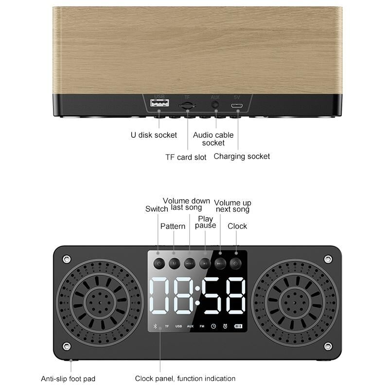 9. Functions: Clock, alarm clock, Bluetooth, 3.5mm audio input, TF card, U disk playback, FM radio