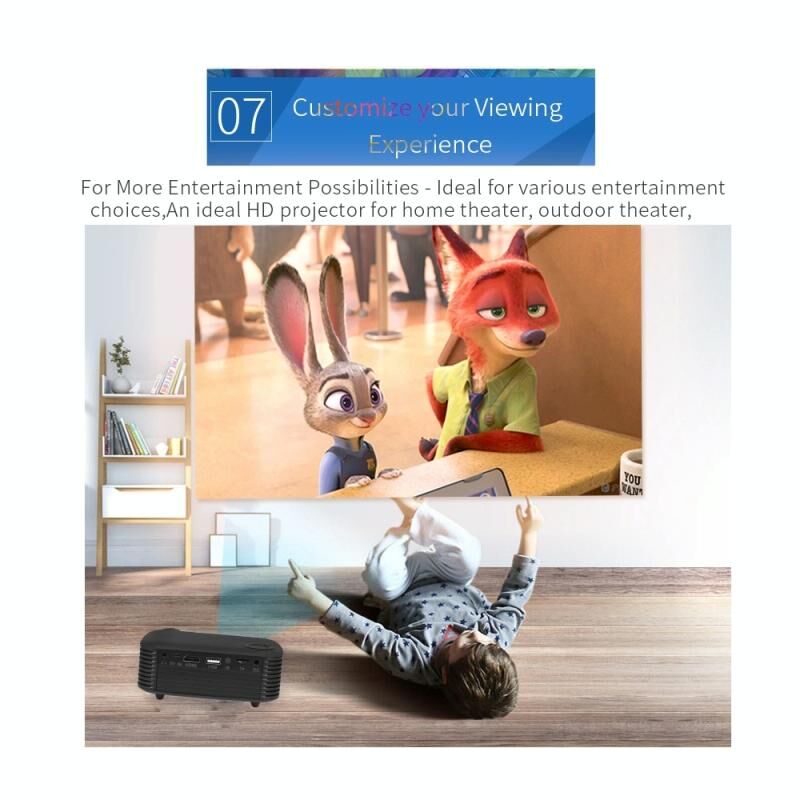 1. Portable and Lightweight: The mini projector is lightweight and compact in size. Smaller than phone, it can be put at any place. You can also take it out for a trip.