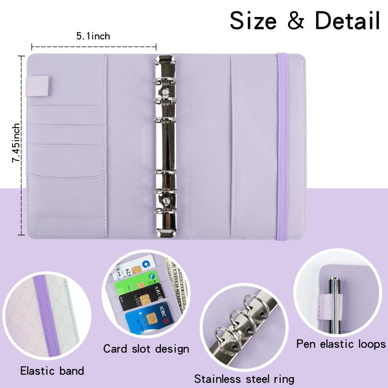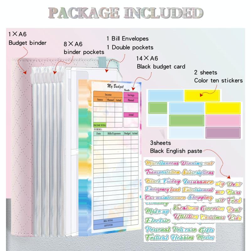 6. Set contains: 1 shell + 8 zipper pocket + 1 information pocket + 1 double pocket + 14 financial pages + 3 sheets gradient English stickers + 2 sheets colorful stickers