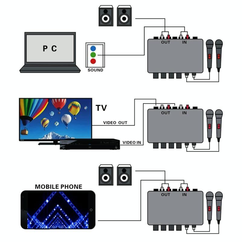 5. Support two sets of microphone input (6.3mm TRS), enable the simultaneous double singing function.