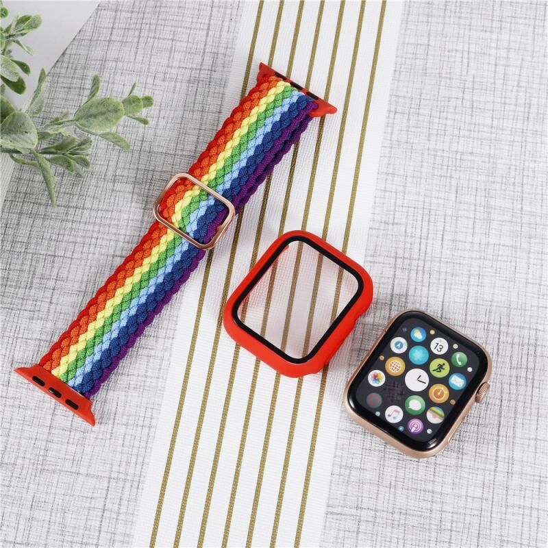 Ρυθμιζόμενο λουρί ρολογιού από υφαντό νάιλον με ρίγες + Σετ θήκης ρολογιού για Apple Watch Series 7 45mm/6&SE&5&4 44mm/3&2&1 42mm (Μαύρο Λευκό Μωβ)