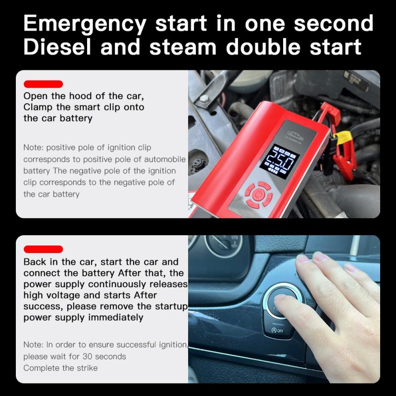 2.As electric tire inflator and when the car is in a state of power loss and cannot be started, it can only be started by using the emergency power supply