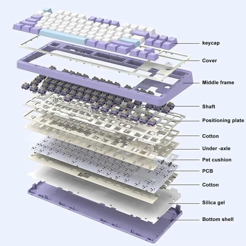 4. 5-layer packing gasket structure: Non-pre-loaded structure design, adding five layers of sound-absorbing materials, effectively reducing the noise of the keyboard cavity, the sound is clearer